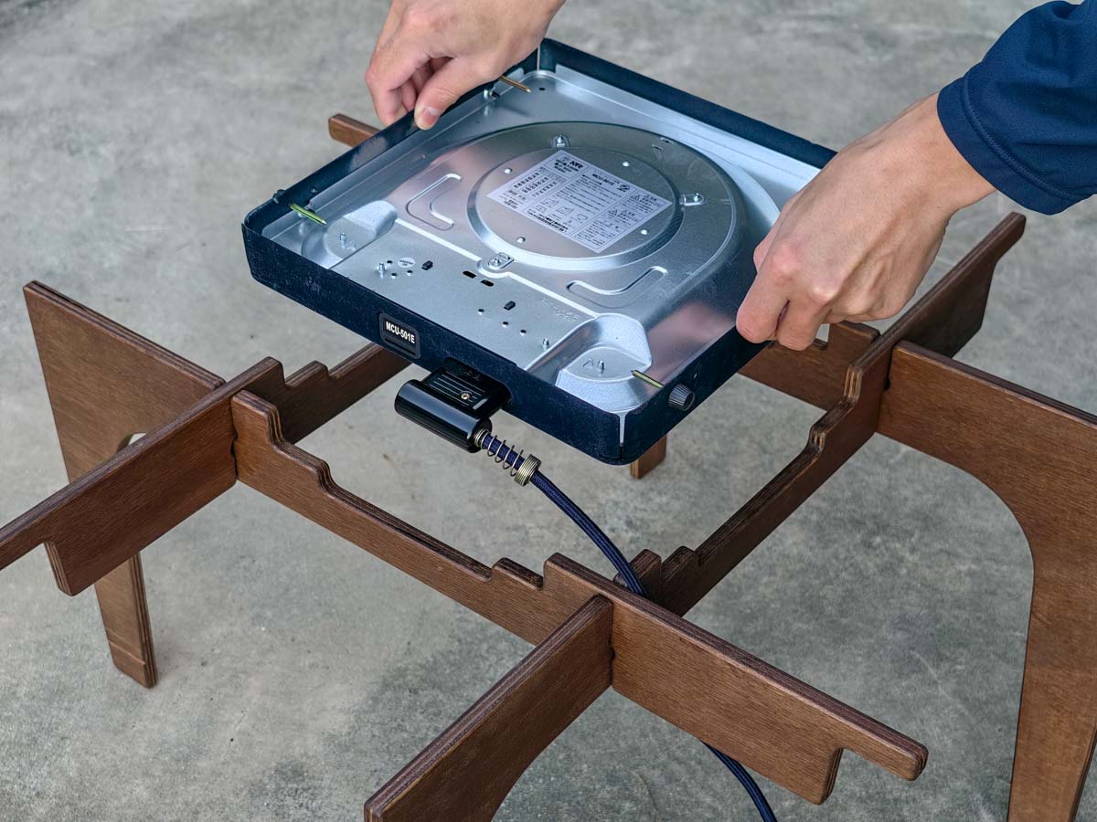 従来モデルは、豆炭が発する大きな熱量に耐えるため特殊な天然木積層板を使用していました。