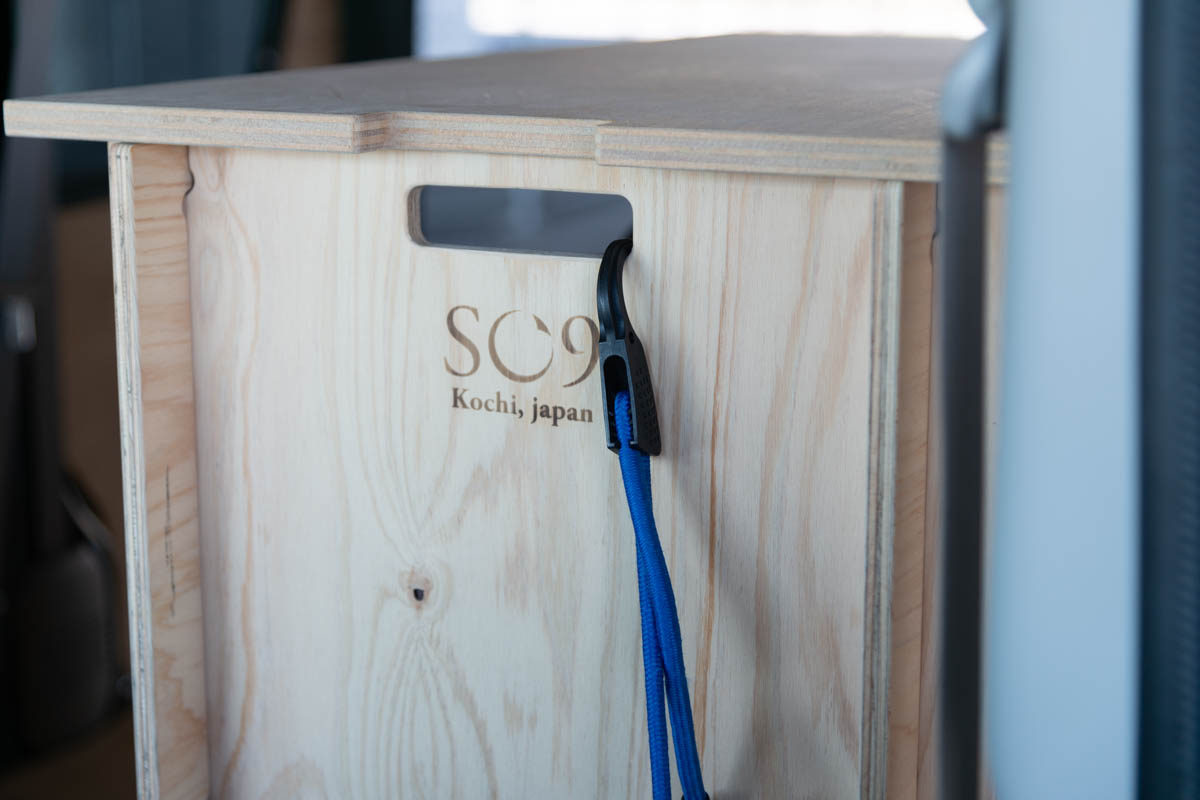 運転中にバンライフシェルフをスタッキングした状態で利用する場合、適切な長さのゴム紐などで取っ手部分を車体を連結してください。