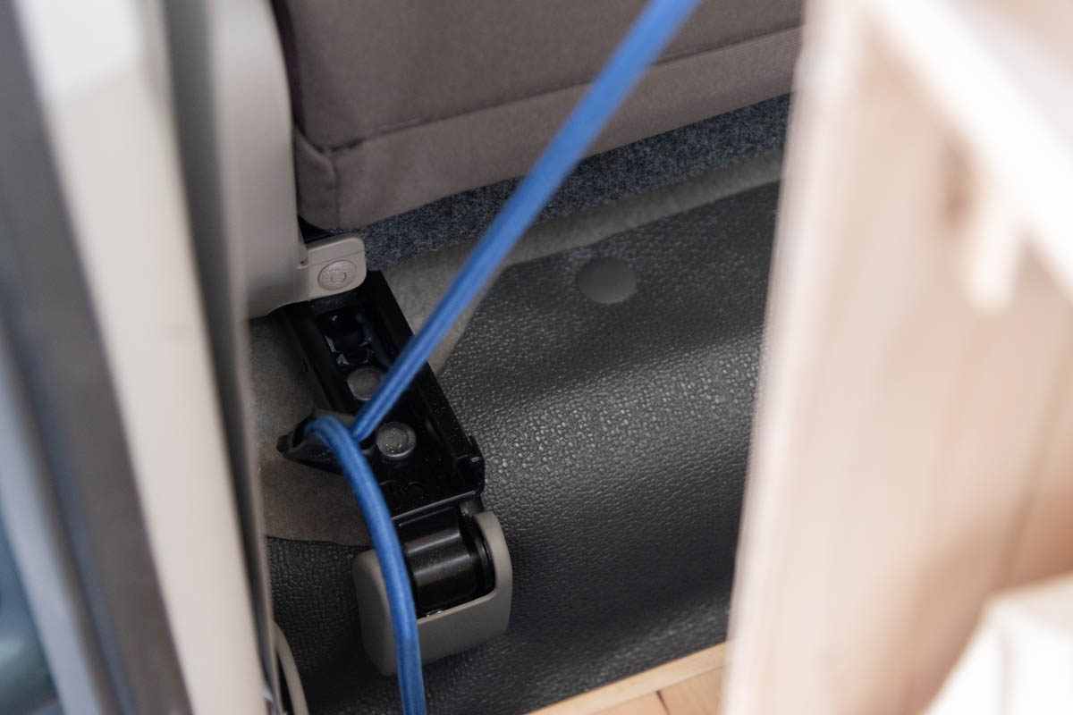ホームセンターなどで購入できるバンジーコード(両端にフックのついたゴム紐)を利用して、簡単に荷物の脱落を防止できます。推奨長さは60cmですが、ゴムの張力により最適な長さが異なるため、実際にバンライフシェルフにセットした状態で確認を行ってください。